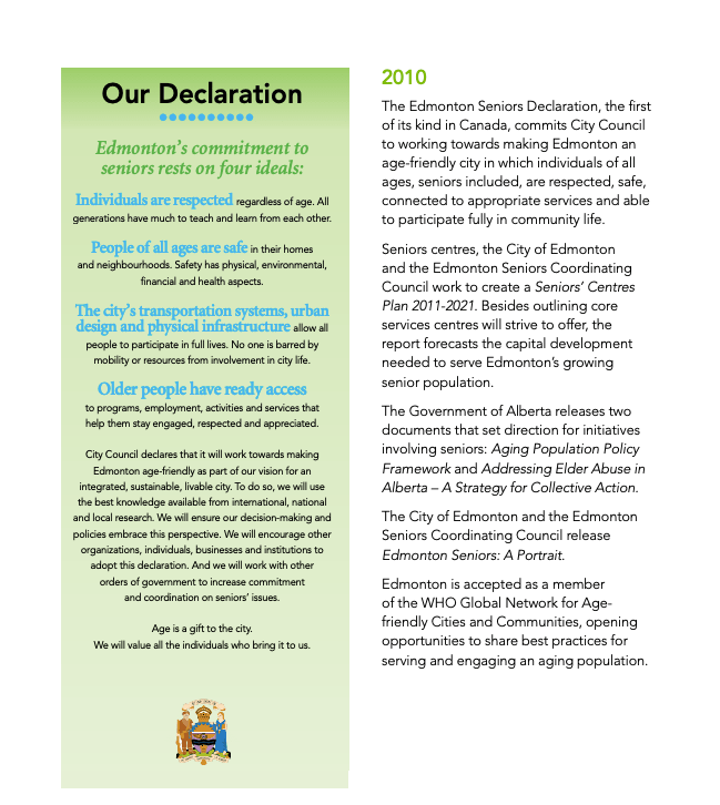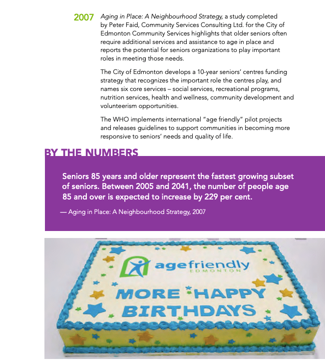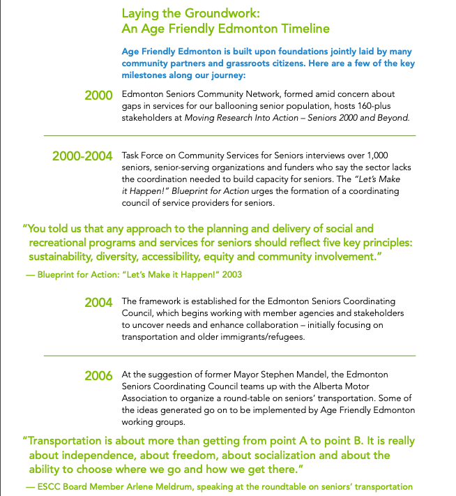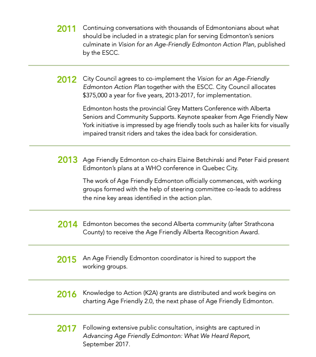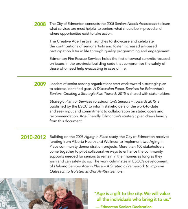 The city of Edmonton has been a leader in municipal policy regarding age-friendly practices. The city, and the Edmonton Seniors Coordinating Council have partnered to start the Age-Friendly Edmonton initiative. Check out the timeline below!